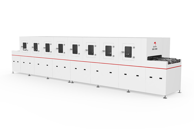 洁盟全自动通过式喷淋清洗机是一款由喷淋清洗、喷淋漂洗、风切吹干等工序组成的自动化清洗设备,其采用伺服电机驱动链条推杆传送工件,清洗效率高,适用于大批量生产清洗需求。