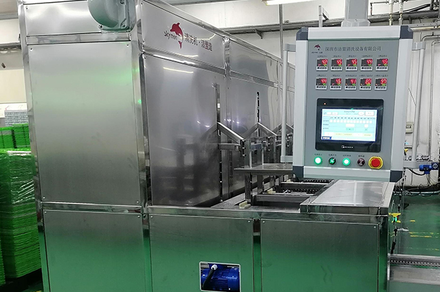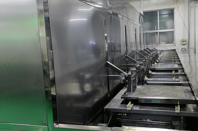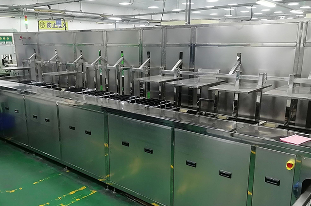 上料→高压喷淋清洗→超声波清洗→超声波清洗→高压喷淋清洗→超声波漂洗→超声波漂洗→超声波漂洗→风切吹水→离心甩干→热风干燥→热风干燥→下料